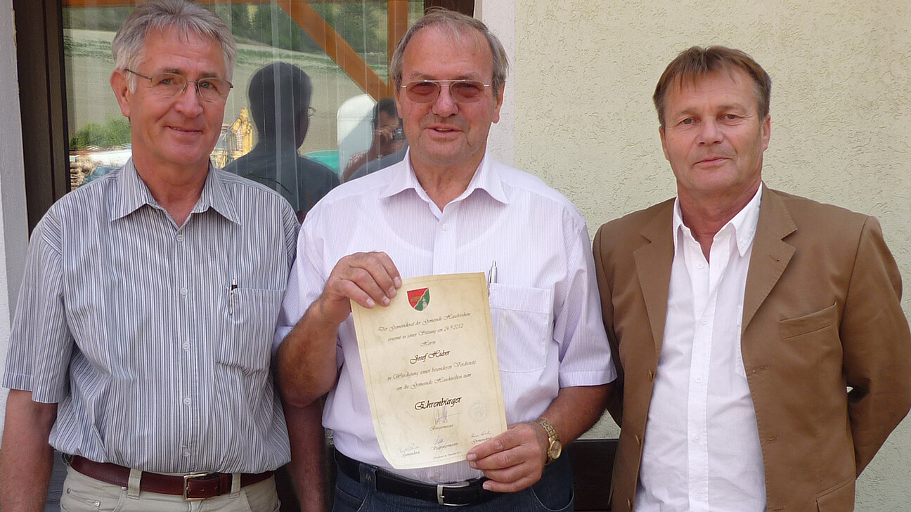 In Anerkennung seiner besonderen Verdienste um die Großgemeinde Hauskirchen, wurde Bgm.a.D. Josef Huber mit der Ehrenbürgerschaft belohnt. Bgm. Helmut Arzt und Vbgm. Alfred Hammer überreichten am 6.9.2012 die hohe Auszeichnung. Stolz präsentiert der Altbürgermeister seine Urkunde.