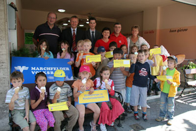 Im Rahmen der Aktion „Kinderösterreich“ spendierte LH Erwin Pröll am Int. Tag des Kindes allen Volksschulkindern in Gänserndorf ein Gratis-Eis. Tatkräftig unterstützten diese Aktion die Volksbank Marchfeld und der Eissalon Fausti.
